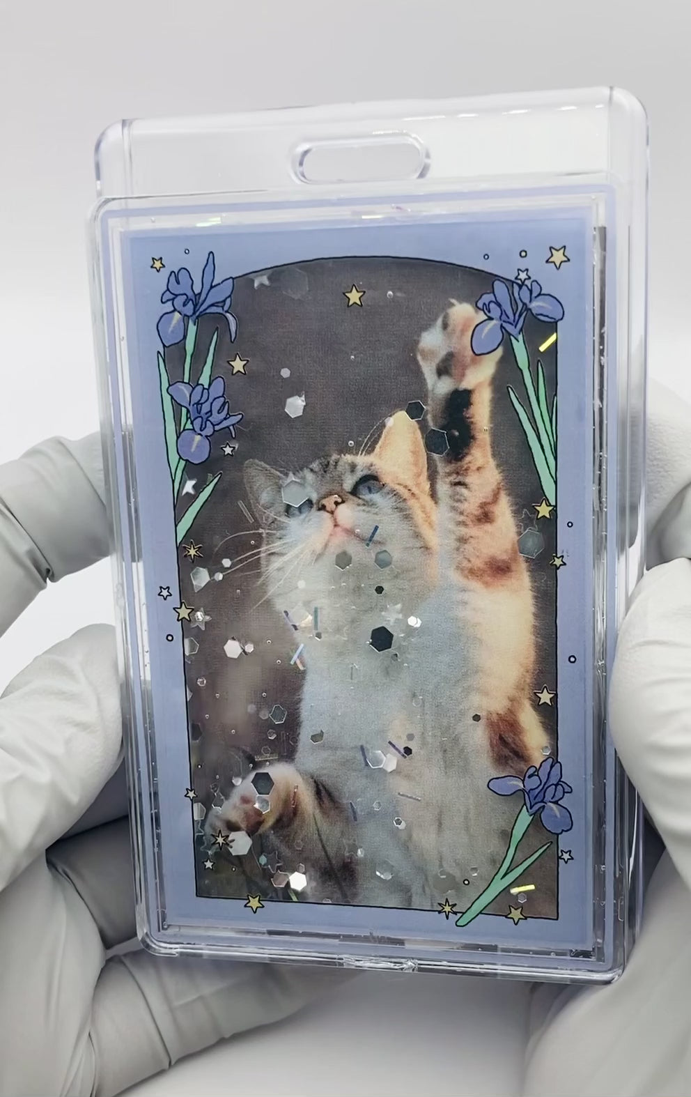 The front of the Top Loader features charming illustrations, while the interior contains liquid with floating sparkles. The back compartment, which holds the liquid, can accommodate items such as photos or cards, measuring approximately 55*90 mm in size.